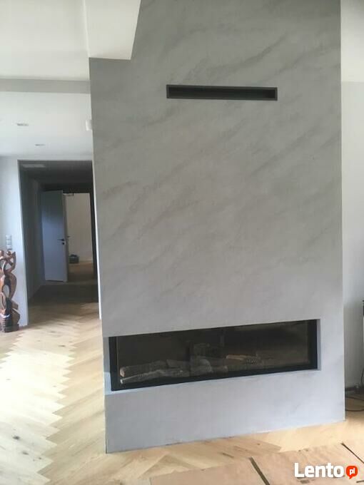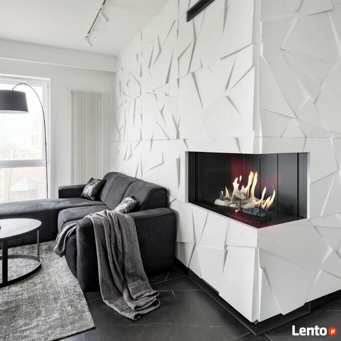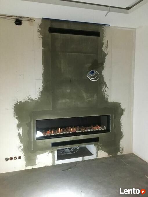 Montaż zabudowę kominkowa GAZOWEGO w prostej supernowoczesnej stylistyce z płyt krzemianowo wapiennych Skamotec (bardzo wysokiej klasy izolacja stosowana przy budowie kominków, jej wytrzymałość na temperaturę to aż 1200 st.C)